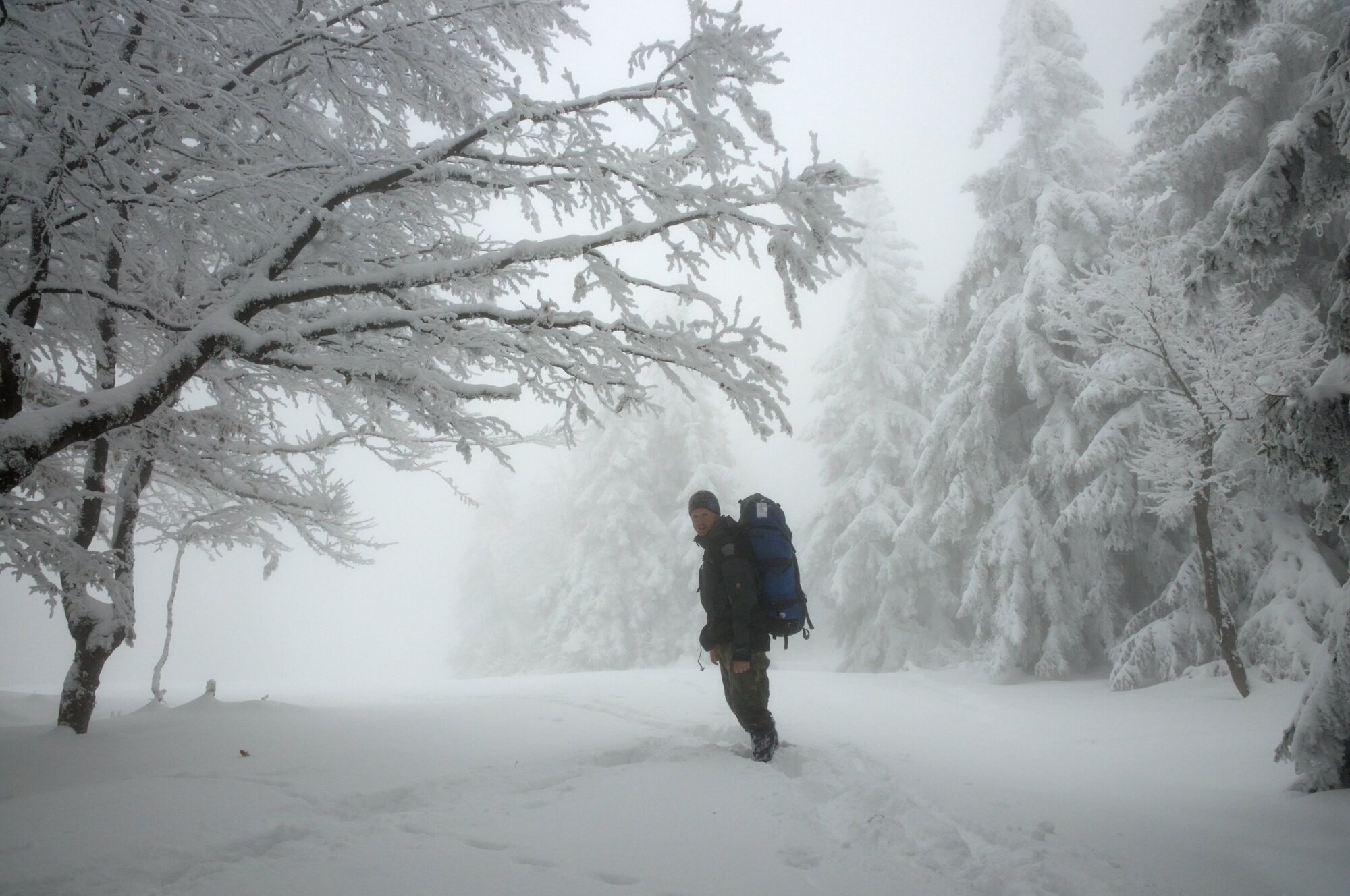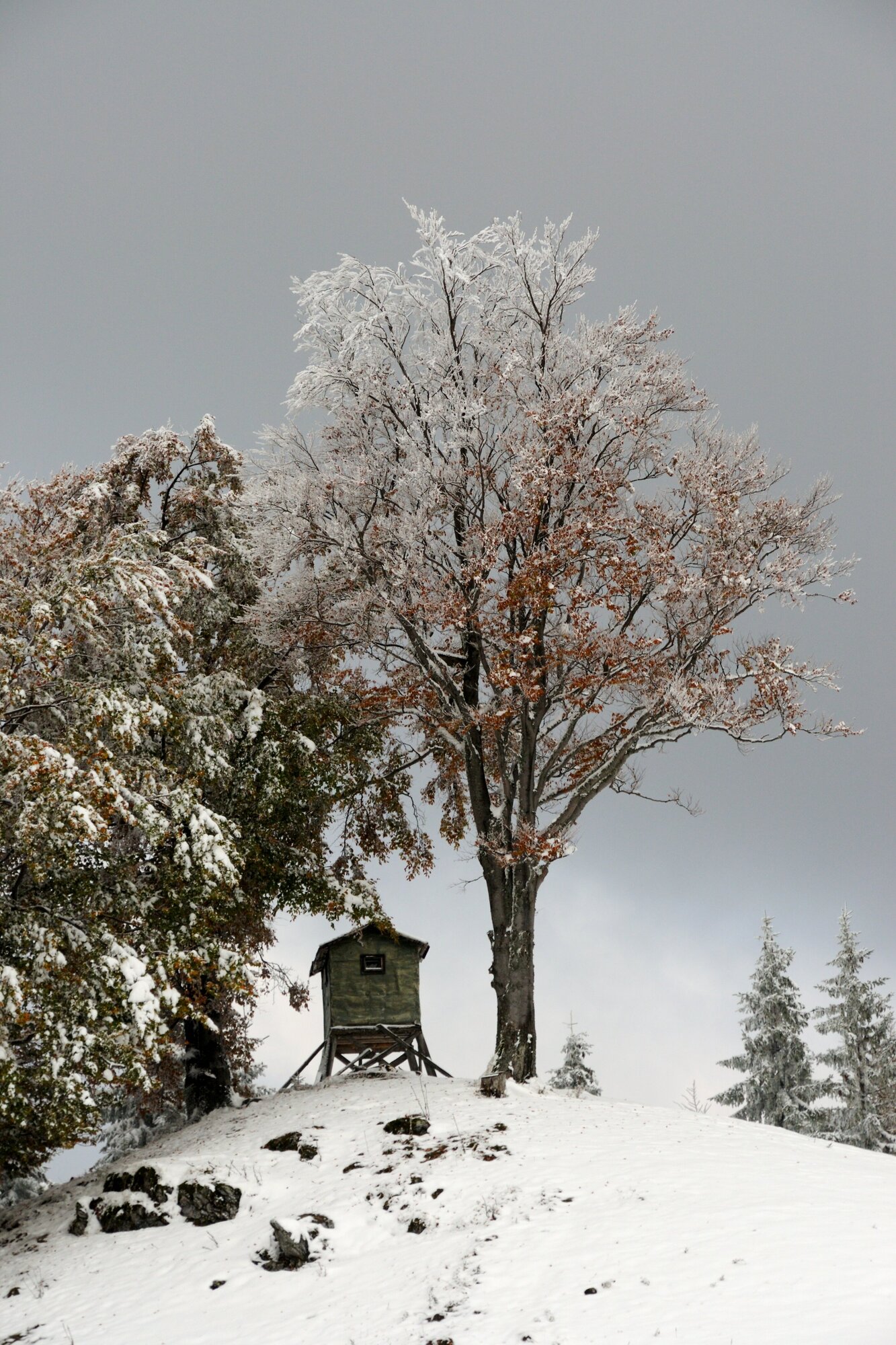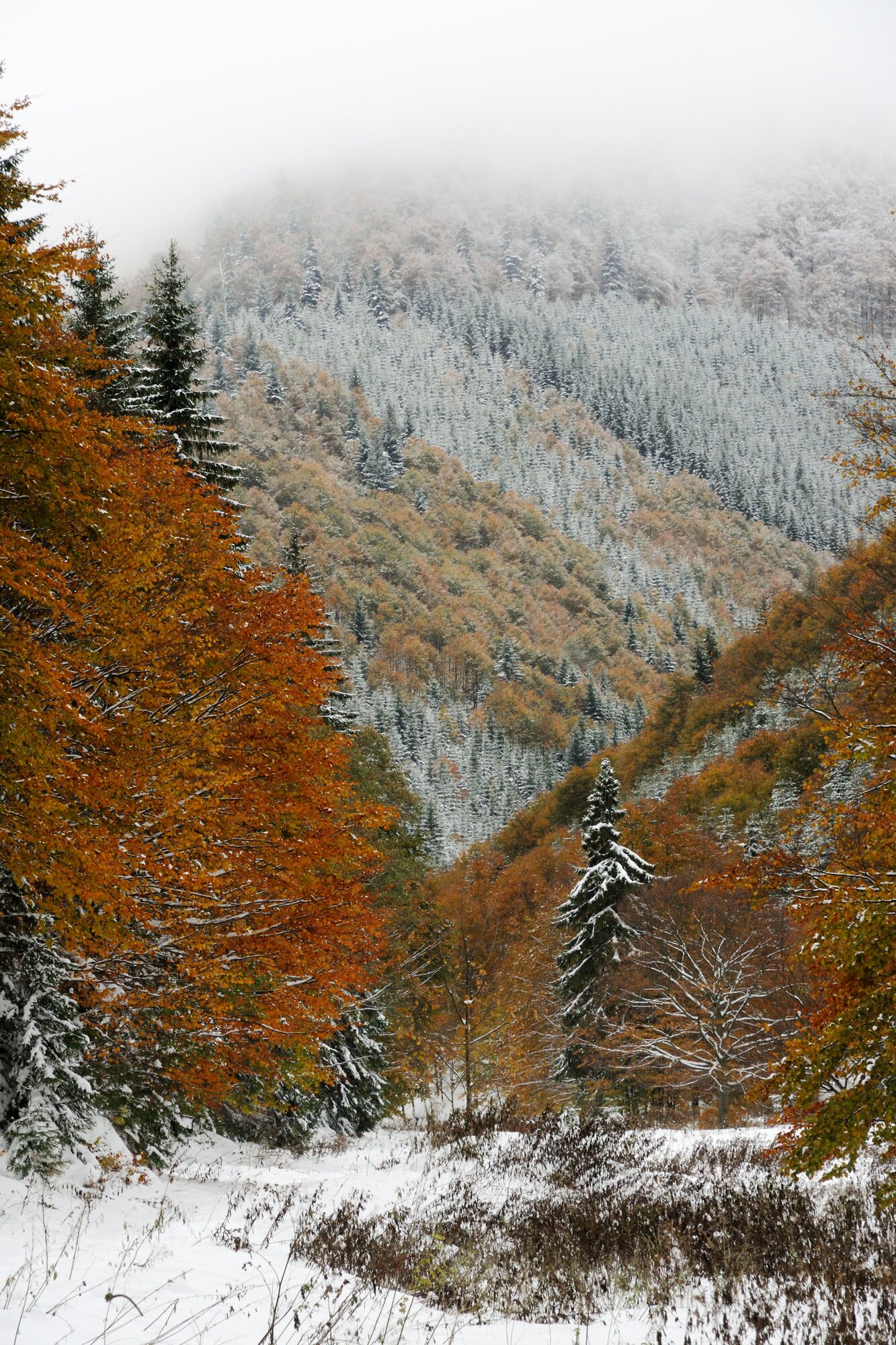 Přestože říjen nebývá zimní měsíc, v roce 2009 skoro byl. Do hor a lesů s dosud neopadaným listím přišla sněhová kalamita a vytvořila tak zvláštní barevný zimní obraz. A nás nechala prošlapávat po hřebenovce stopu.